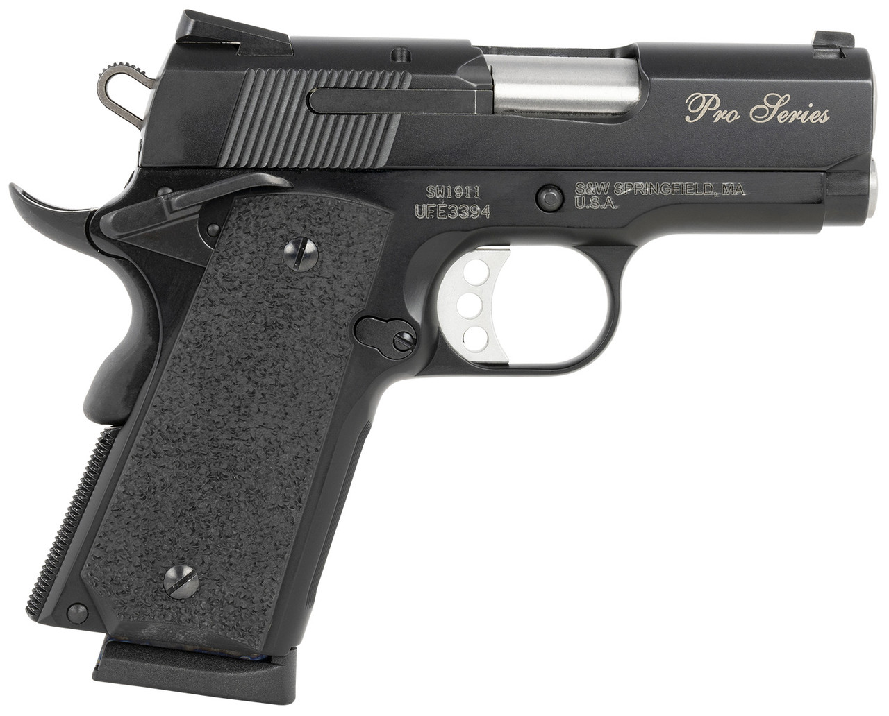 S&W Performance Center Pro Series features an oversized external extractor; three-hole curved trigger with overtravel stop; full length guide rod; a grip/ambidextrous thumb safety; stainless steel barrel and slide; Scandium alloy frame with an overall black finish. Includes two magazines.